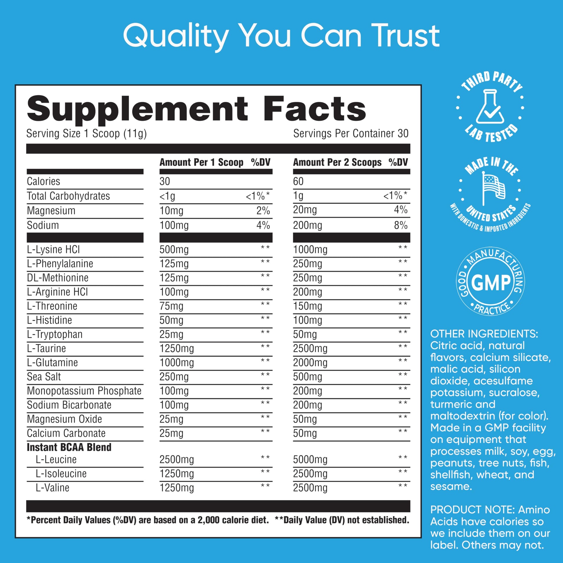 - PROVEN 2:1:1 BCAA RATIO: Full spectrum amino acid support including the proven 2:1:1 ratio of L-Leucine, L-Isoleucine, and L-Valine (BCAAs) to promote post workout muscle repair, help build lean muscle, and accelerate overall recovery