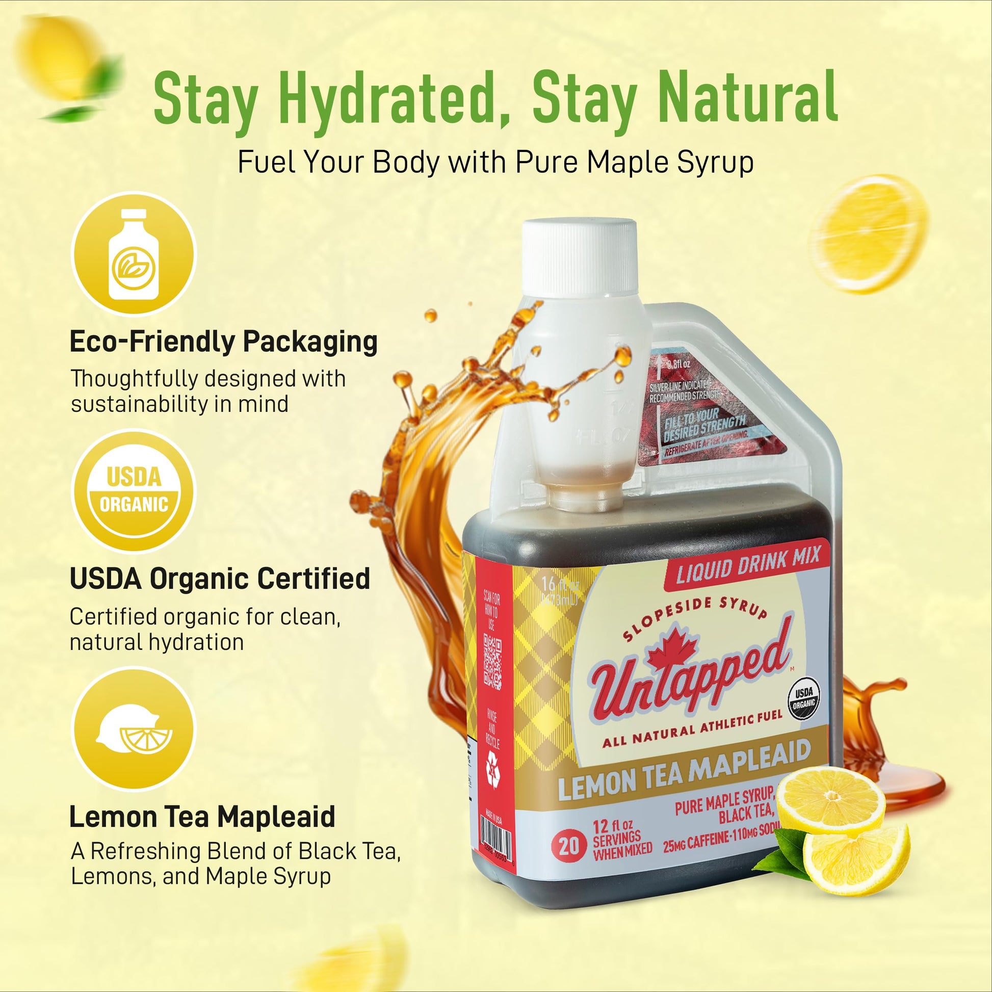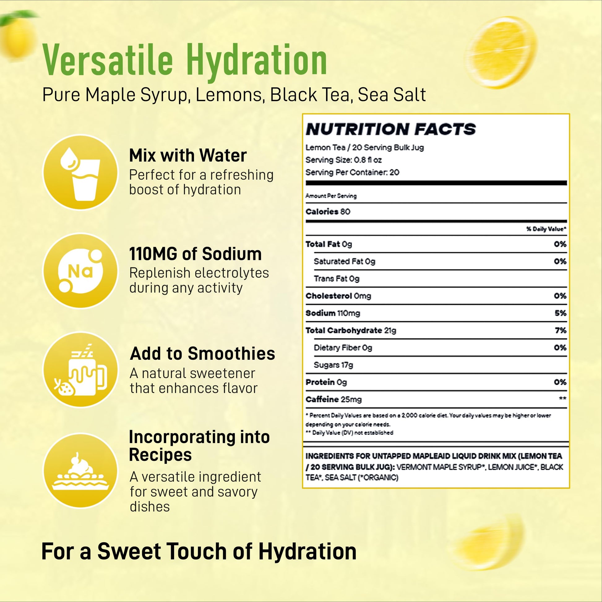 - Crisp & Energizing: Lemon Tea Mapleaid offers the crisp taste of real lemons combined with organic black tea for a natural caffeine boost. Made with pure maple syrup and sea salt, this liquid concentrate provides refreshing hydration and electrolytes in every sip.