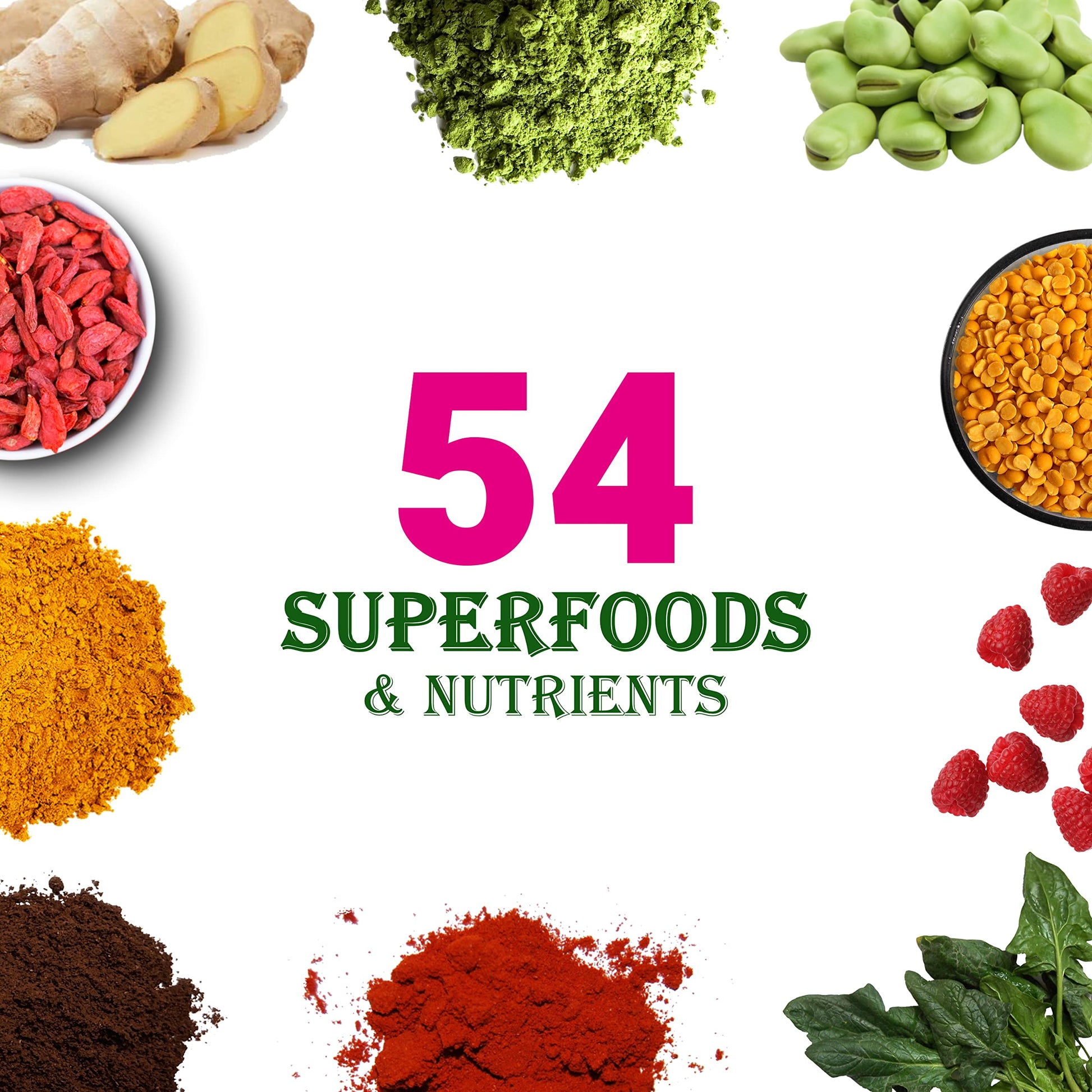 - 𝟱𝟰 𝗦𝗨𝗣𝗘𝗥𝗙𝗢𝗢𝗗𝗦 𝗕𝗟𝗘𝗡𝗗: Containing 54 superfoods, like alfalfa, broccoli, brussels sprouts, kale, black currant, spinach, blueberry, goji berry, raspberry, and seabuckthorn, rich in various vitamins, minerals to supports immune system health