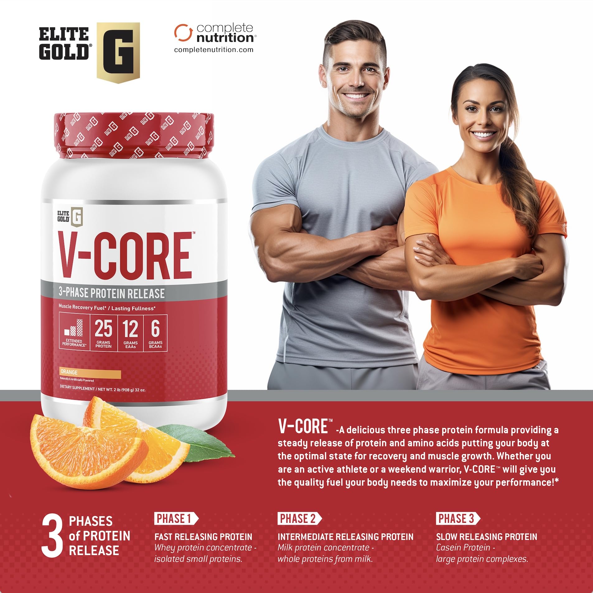 V-Core Orange Cream Protein Powder, Whey Protein, High Protein, Casein Protein, 25g Protein, 12g EAAs, 6g BCAAs, 2 lb Tub (23 Servings)