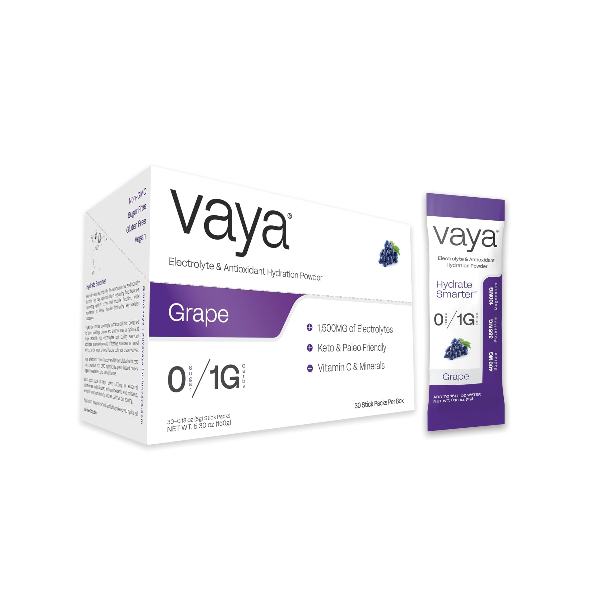 Vaya Sugar Free Premium Hydration Electrolyte Powder | Grape | 30 Stick Packs | 1G Carbs, 1,500MG Electrolytes, Vitamin C & Antioxidants | Non-GMO, Keto, and Paleo Friendly