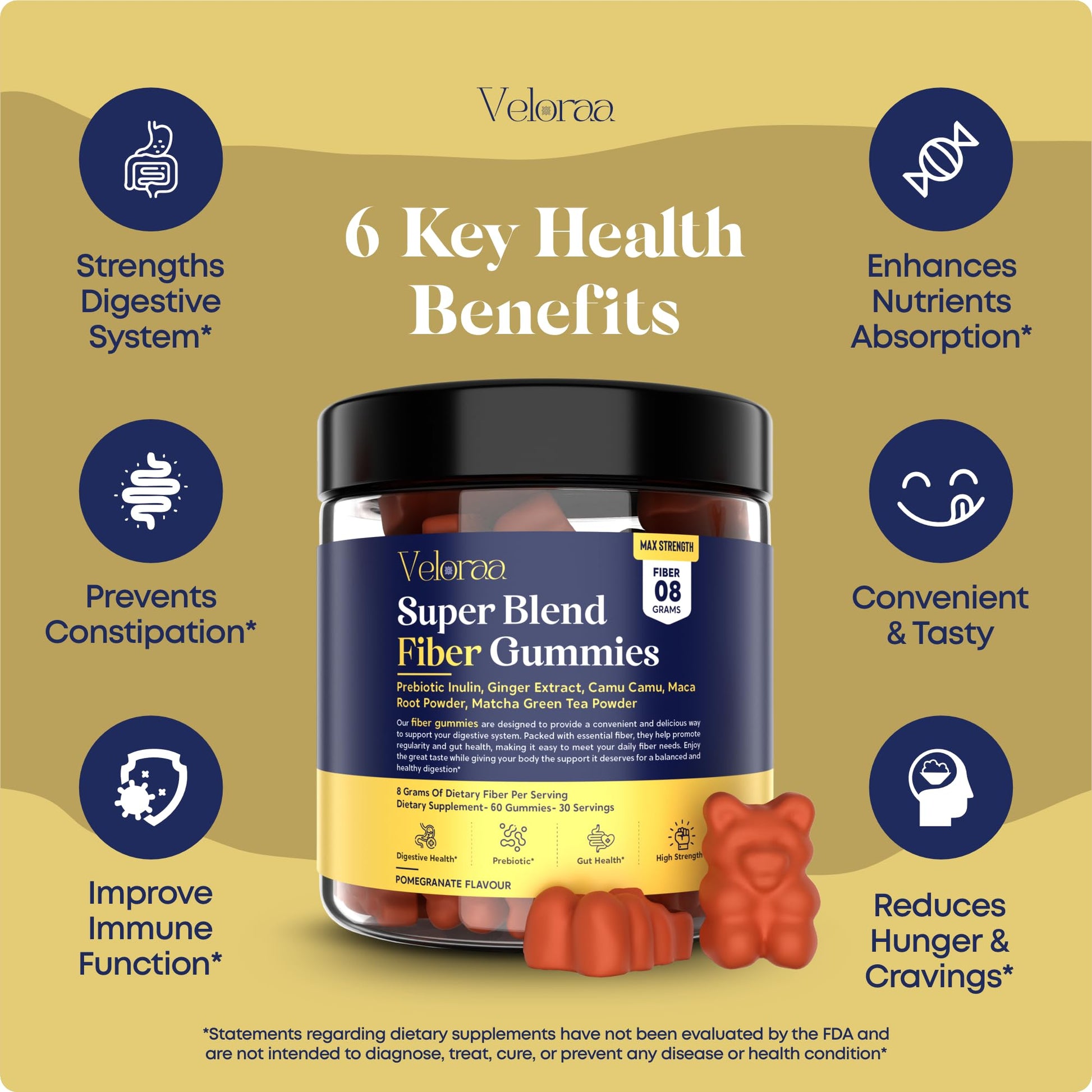 - SUPPORTS DIGESTIVE HEALTH - Veloraa Fiber Gummies are designed to help promote regular bowel movements, easing occasional discomfort and bloating. By supporting smooth digestion, they help you feel lighter and more comfortable throughout the day.