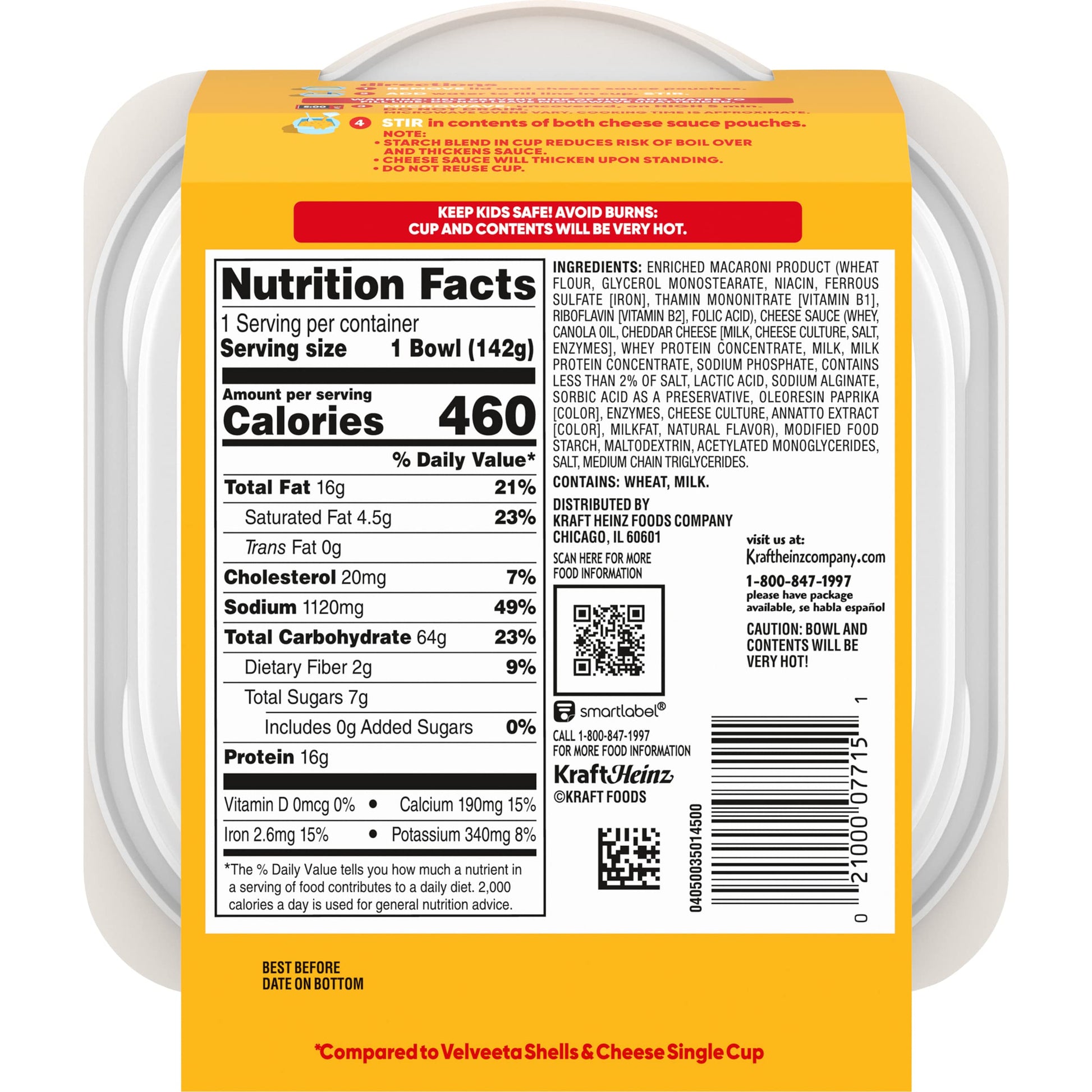 - VELVEETA SHELLS & CHEESE: One 5 oz box of Velveeta Shells & Cheese Original Shell Pasta with 2X the Creamy Shells Big Bowl Microwave Meal