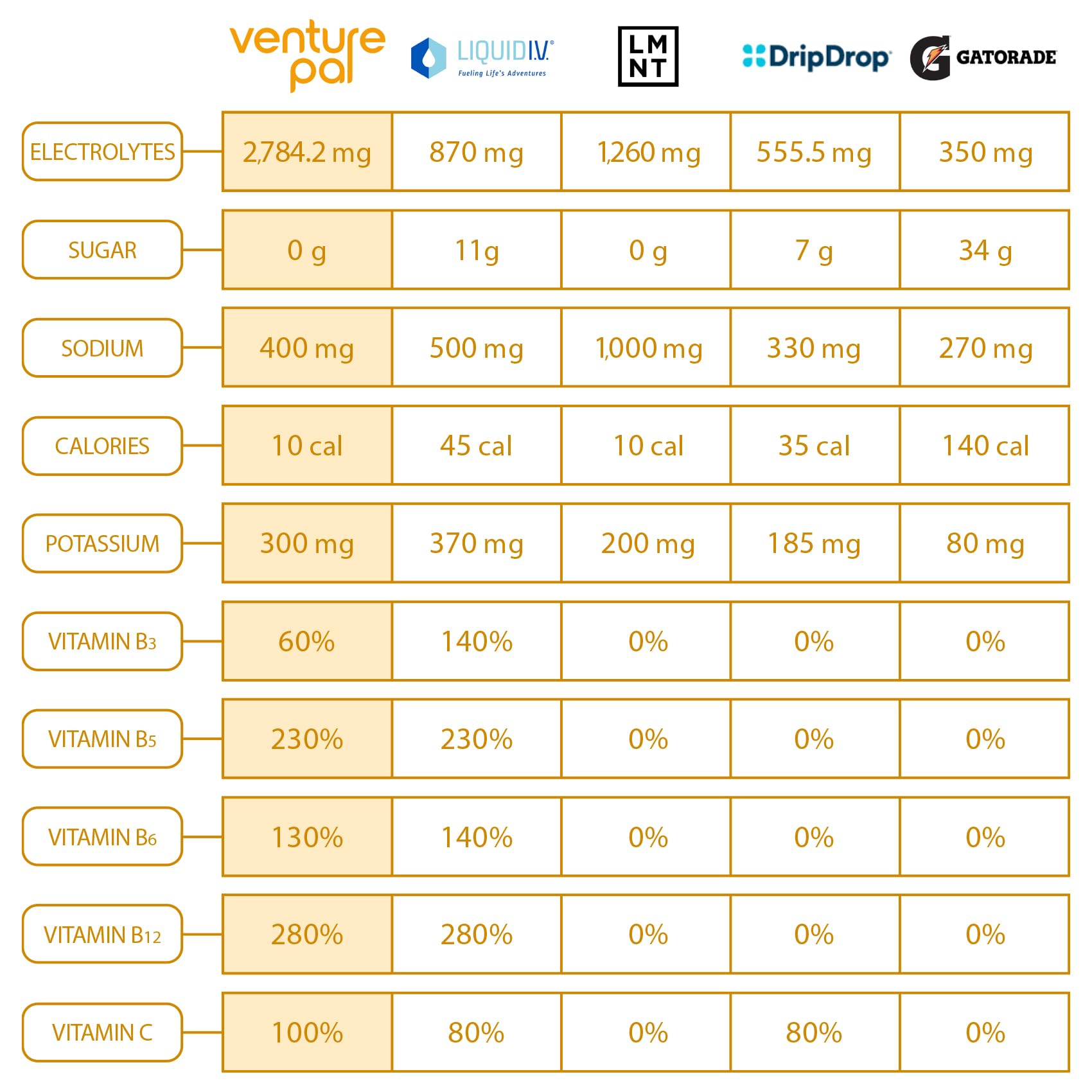 - SUGAR FREE AND OPTIMIZED FORMULA: Everyone knows that sodium plays a key role in maintaining fluid balance. However, most electrolyte mixes on the market are either too salty or too sweet. Venture Pal's Hydration Boost has zero sugar and an optimized sodium level within the daily value recommended by The American Heart Association