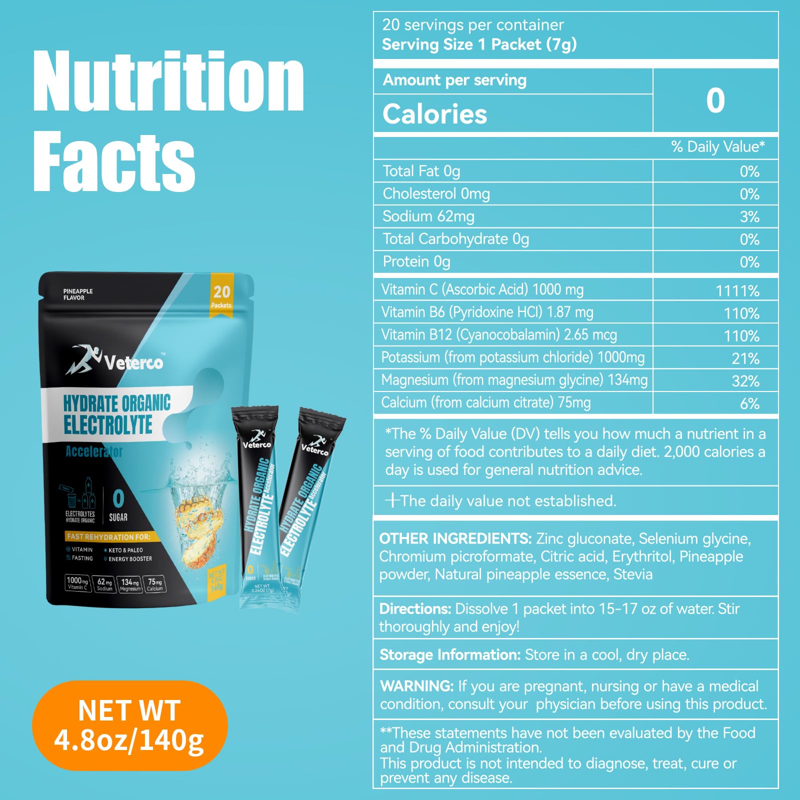 Veterco Hydration Electrolyte Powder, Electrolyte Drink, Hydration Supplement Drink Mix, Hydration Packets with Vitamin & Mineral, Keto Friendly, Vegan, Non-GMO, No Sugar, Pineapple Flavor (20 Sticks)