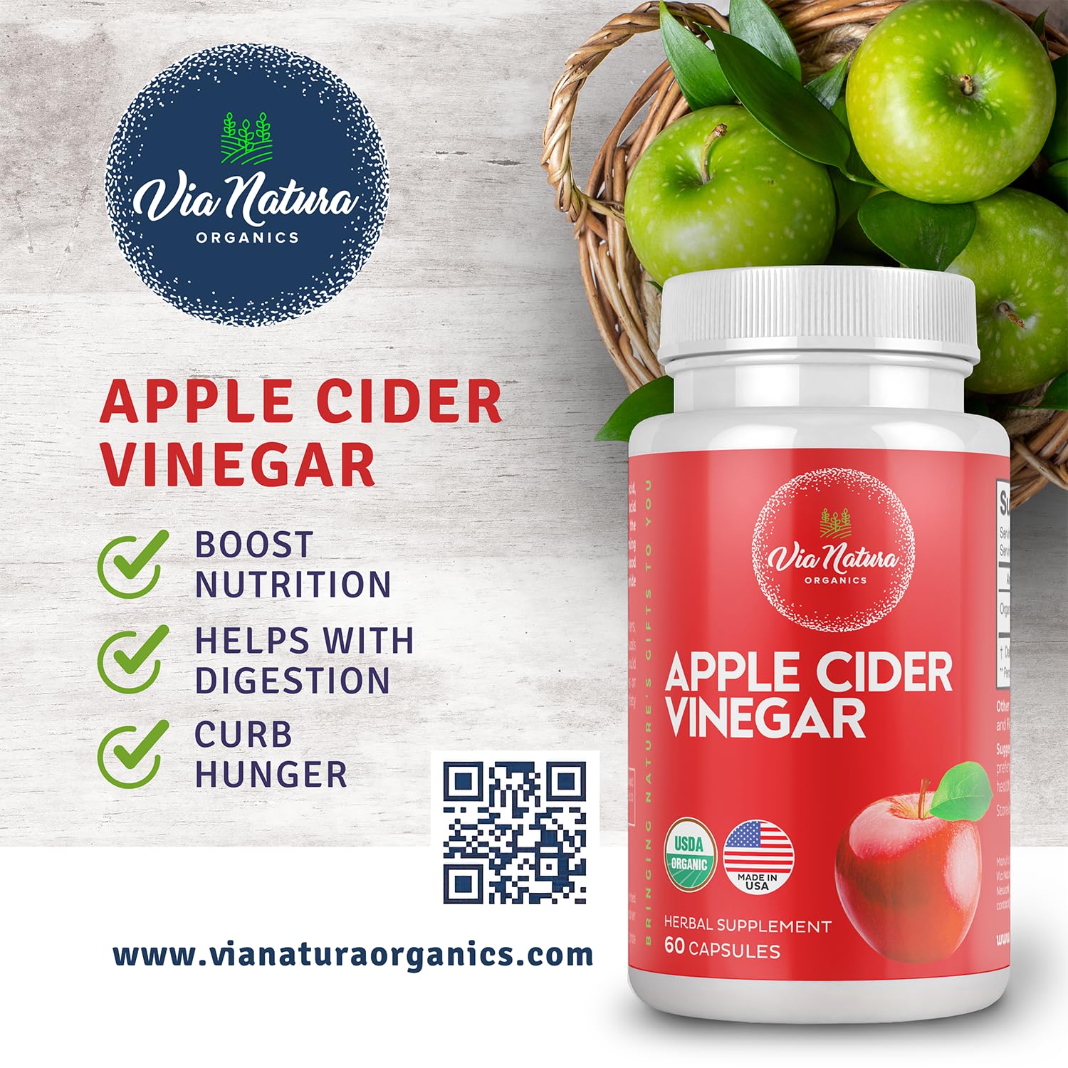 Via Natura Organics Apple Cider Vinegar Capsules 1000mg | Organic Herbal Supplement | 60 Capsules