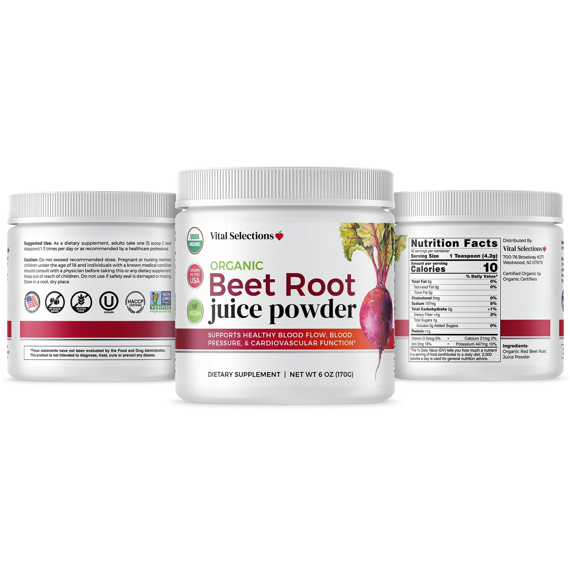 - The Ultimate Nitric Oxide Booster: Vital Selections Organic Beet Root Juice Powder contains the Highest Levels of healthy Dietary Nitrates, which your body converts into Nitric Oxide, a compound that naturally improves blood flow. This increased circulation supplies oxygen-rich blood to the brain, liver, and muscles, providing the benefits of sharper cognitive function, blood pressure support, natural detoxification, increased energy, and superior physical training.