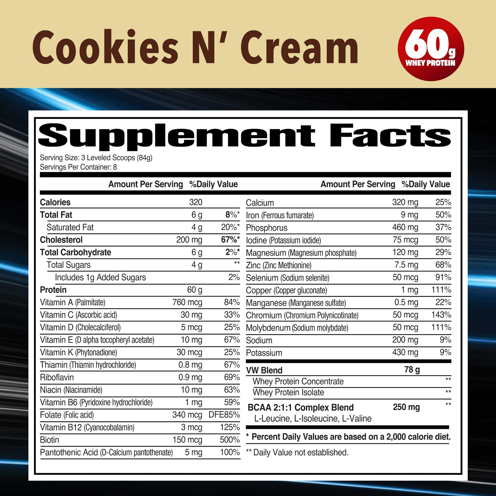 Vitamin Whey Protein, Cookies N Cream, 60g Whey Protein, BCAA Complex, 26 Vitamins & Minerals, Gluten Free, 1.5 LB
