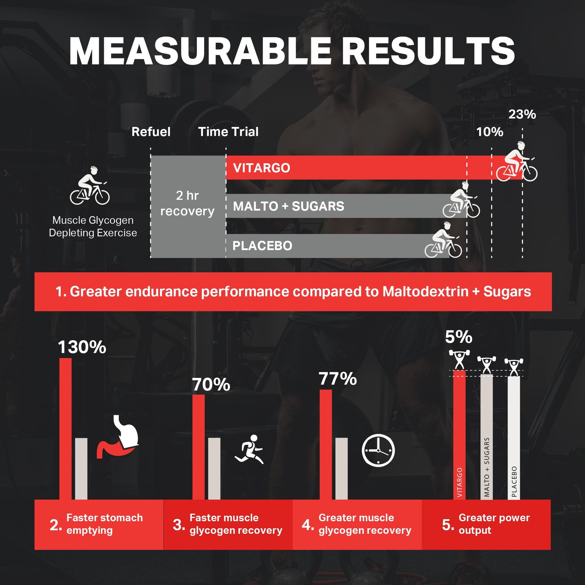 - EXPLOSIVE ENERGY & QUICK MUSCLE RECOVERY Vitargo is a crucial component on an athlete’s journey to greatness.Supports muscle recovery after an intense workout with no bloating and no crashing. Replenish muscle glycogen 70% faster with 77% greater glycogen recovery vs other sports drinks taken after intense glycogen depleting workouts.