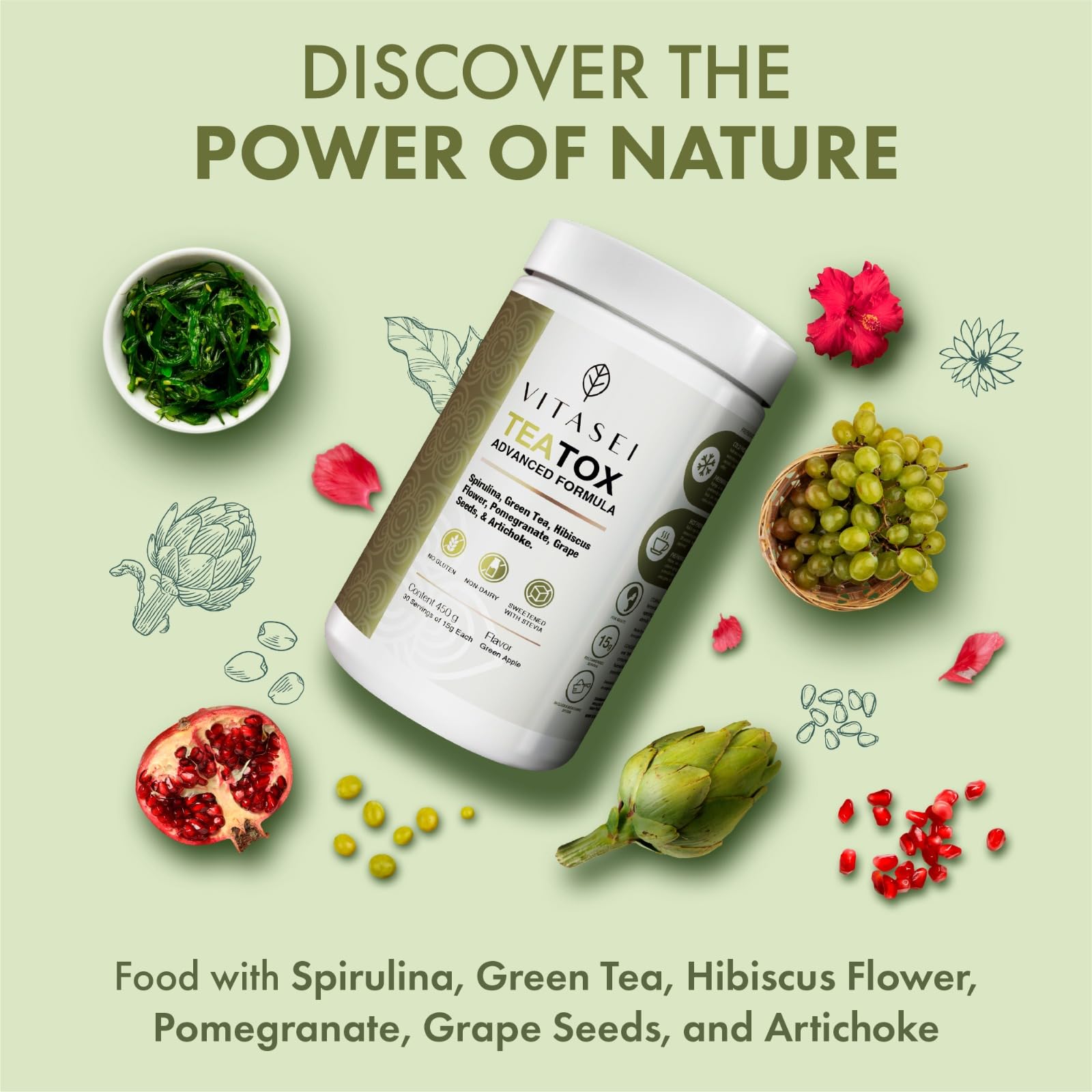 Vitasei Teatox Detox & Cleanse Support Powder, Digestion Booster W/Green Tea, Spirulina, Artichoke, Jamaican Flower & Grape Seeds, Support Supplement & Meal Replacement Powder, Green Apple Flavor 16oz