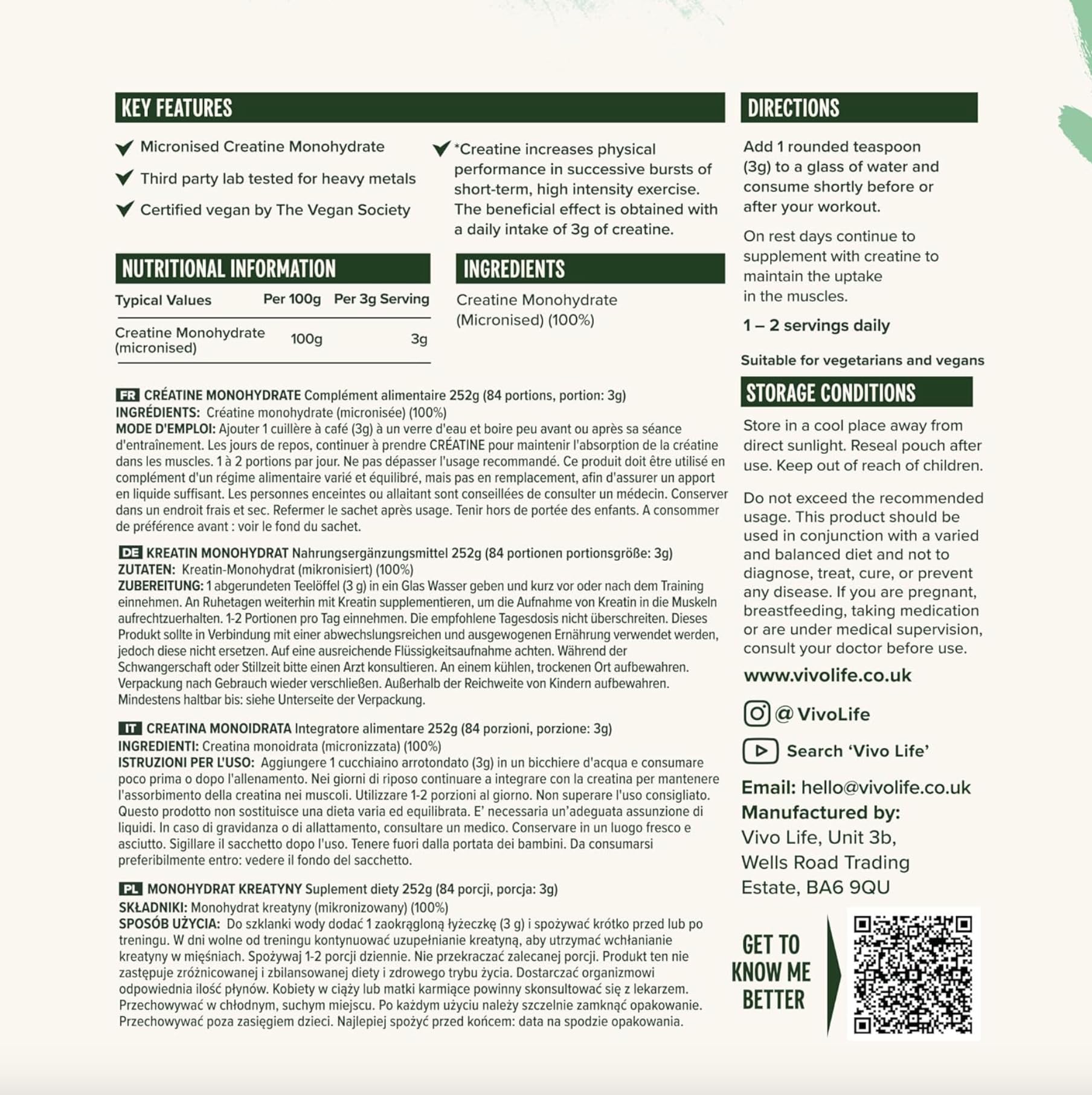 Vivo Life - Creatine Monohydrate Powder Micronised - Vegan, Unflavoured (8.8 oz, 84 Servings)