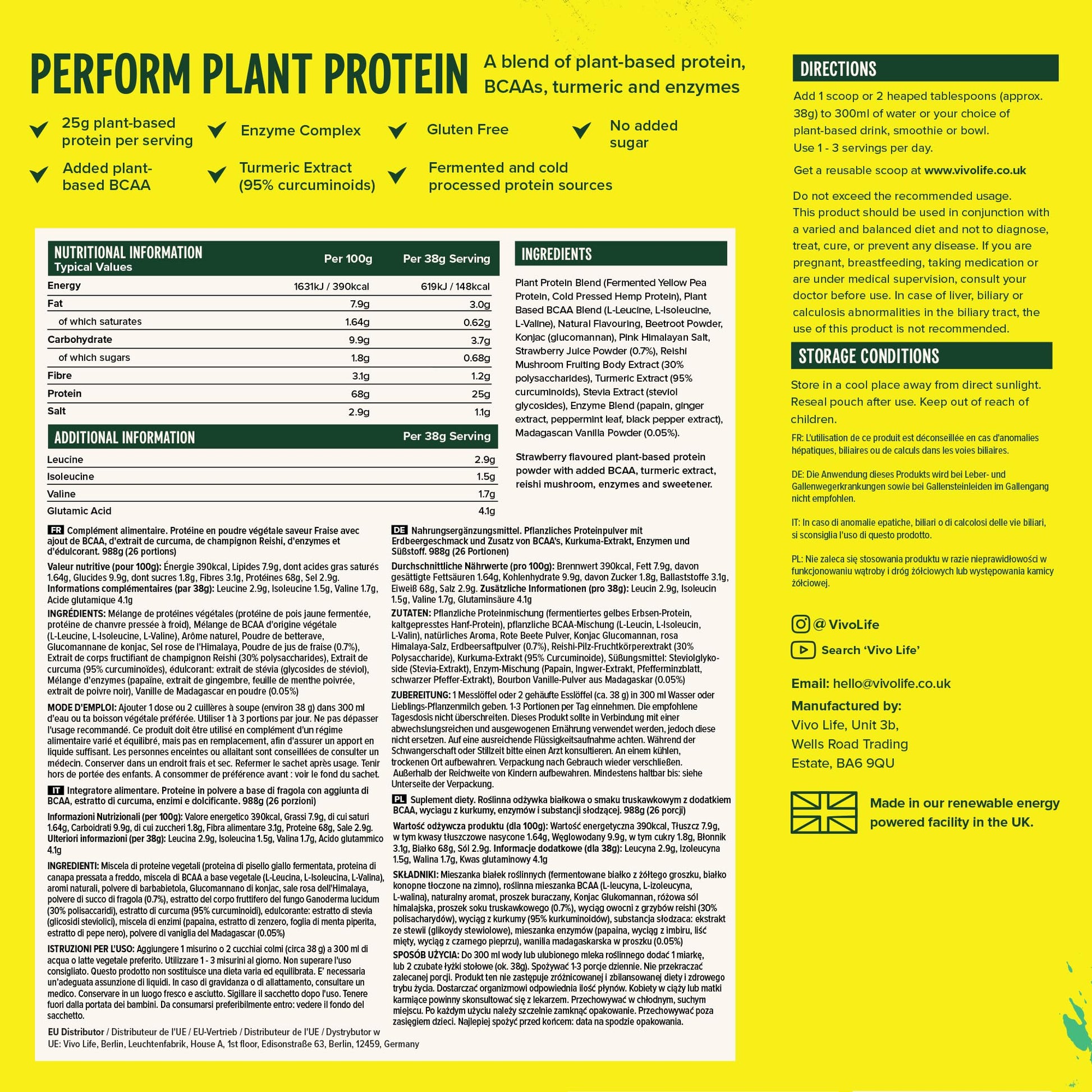 Vivo life Perform Plant Protein Powder - Strawberry & Vanilla, Vegan, 26 Servings - 2.17lb, BCAA Pea & Hemp Blend, Gluten & Soy Free