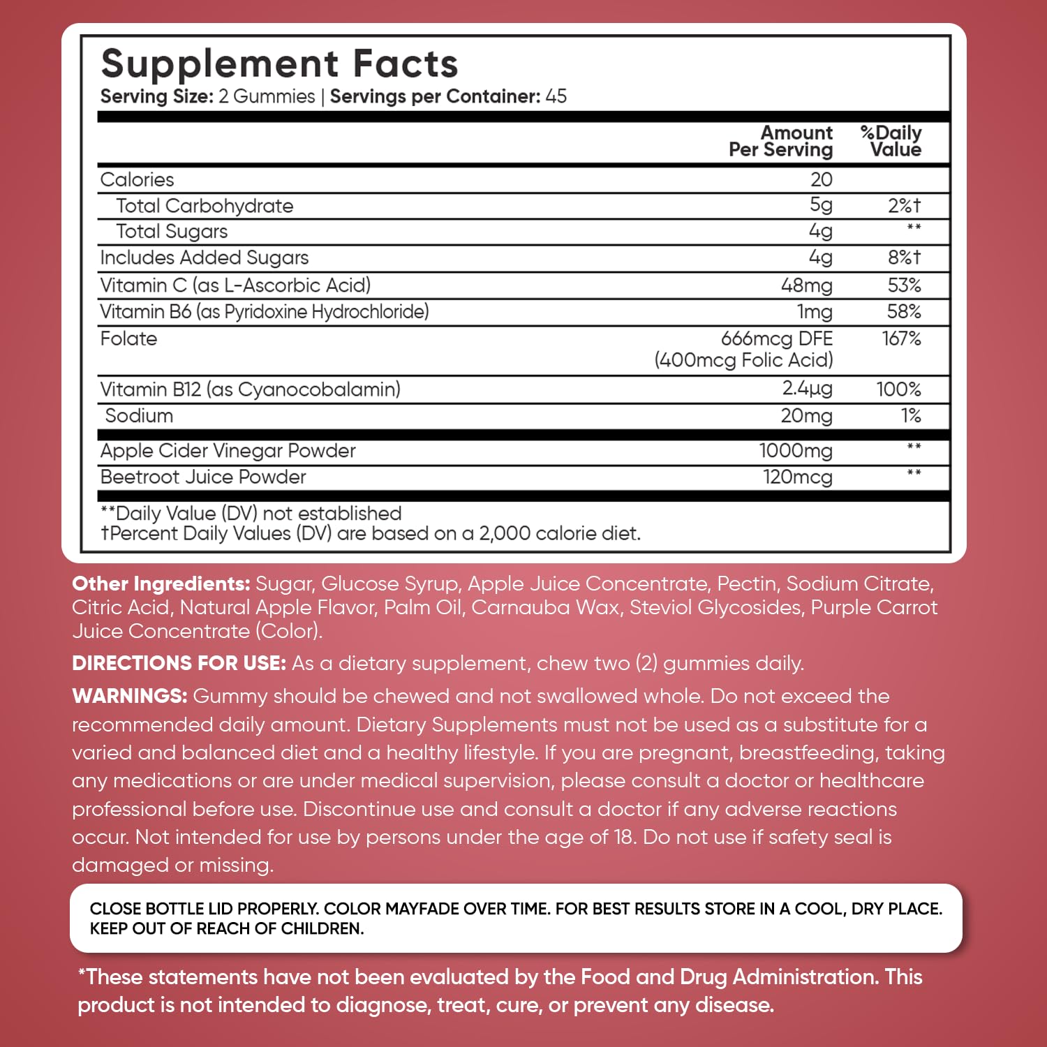 - DETOX, CLEANSE, DIGESTION, & METABOLISM - Our gummies are packed with Vitamin C, B6, B9 (Folic Acid), & B12, known to support metabolism & help you feel fuller. Apple cider vinegar & beetroot help in breaking down food more efficiently for easier digestion and detox. Additionally, sodium plays a vital role in helping to cleanse the body by removing excess unwanted substances. Made of handpicked ingredients, our apple cider vinegar gummies contribute to your overall wellness.