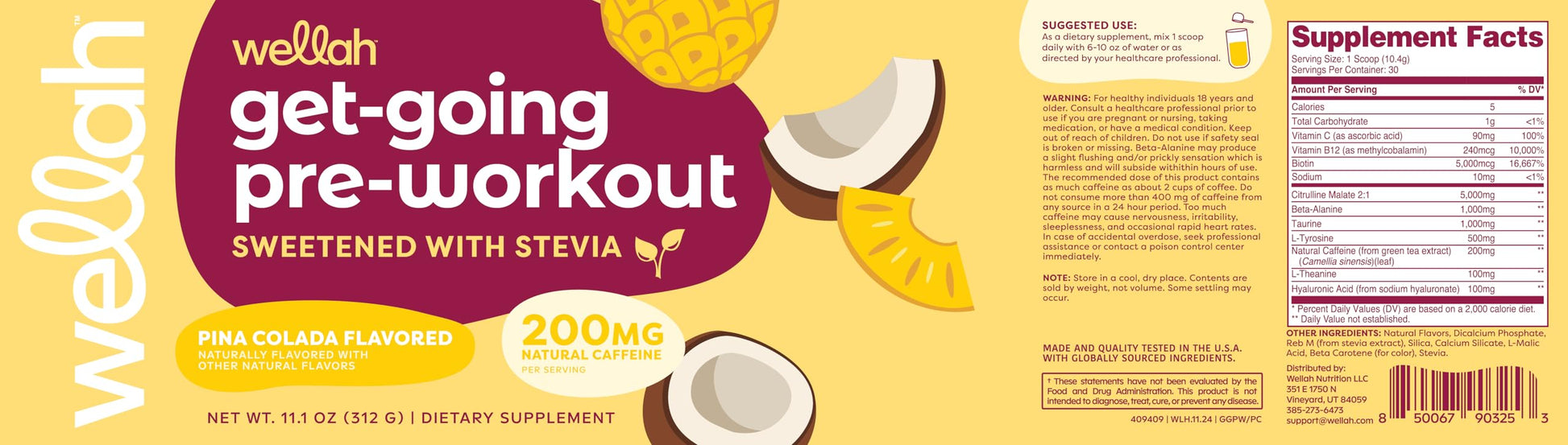 Wellah Get-Going Pre-Workout Drink Mix (Pina Colada Flavored, 30 Servings)