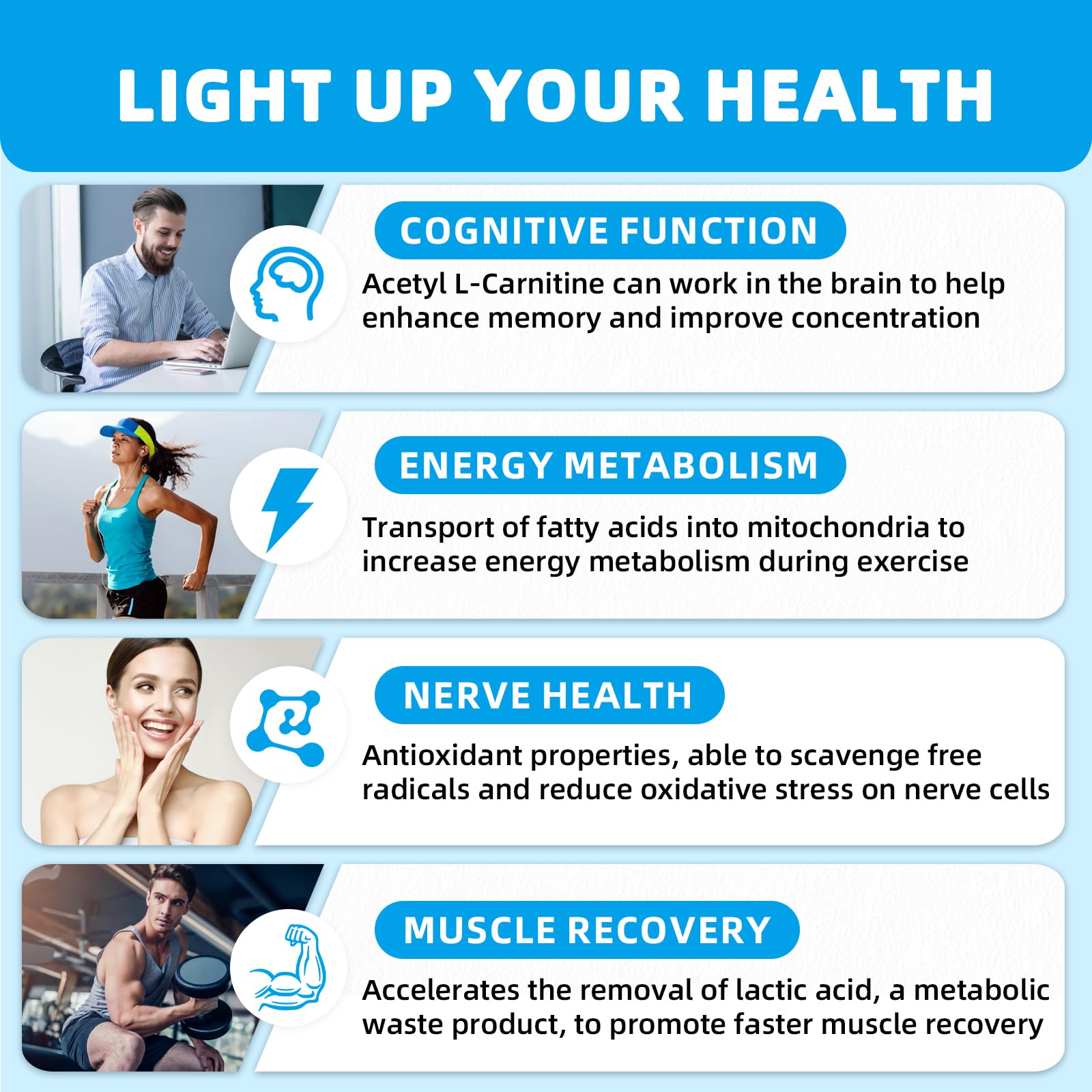 - Memory & Attention: Our brains need a lot of energy to function properly and to be energetic. Acetyl L- Carnitine 1000mg supplement can penetrate the blood-brain barrier to protect the brain tissue and provide enough energy to the brain cells to support memory and cognitive abilities