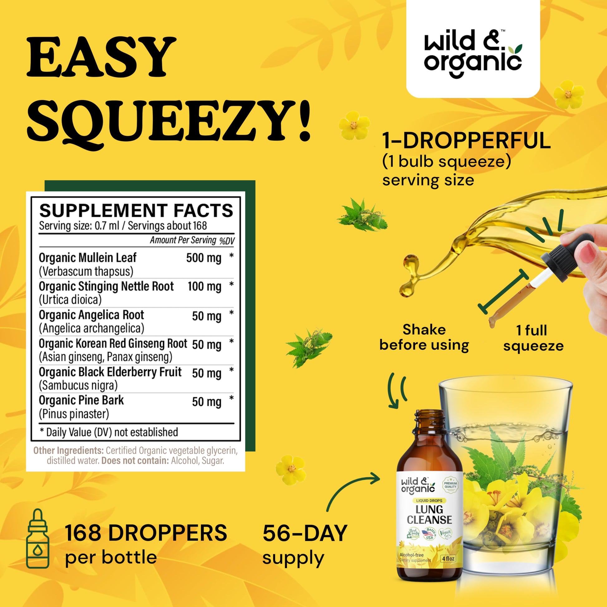 - Lung Cleanse Support: Each serving of Wild & Organic lung cleanse drops contains 500 mg of mullein leaf extract for lungs cleanse and detox.