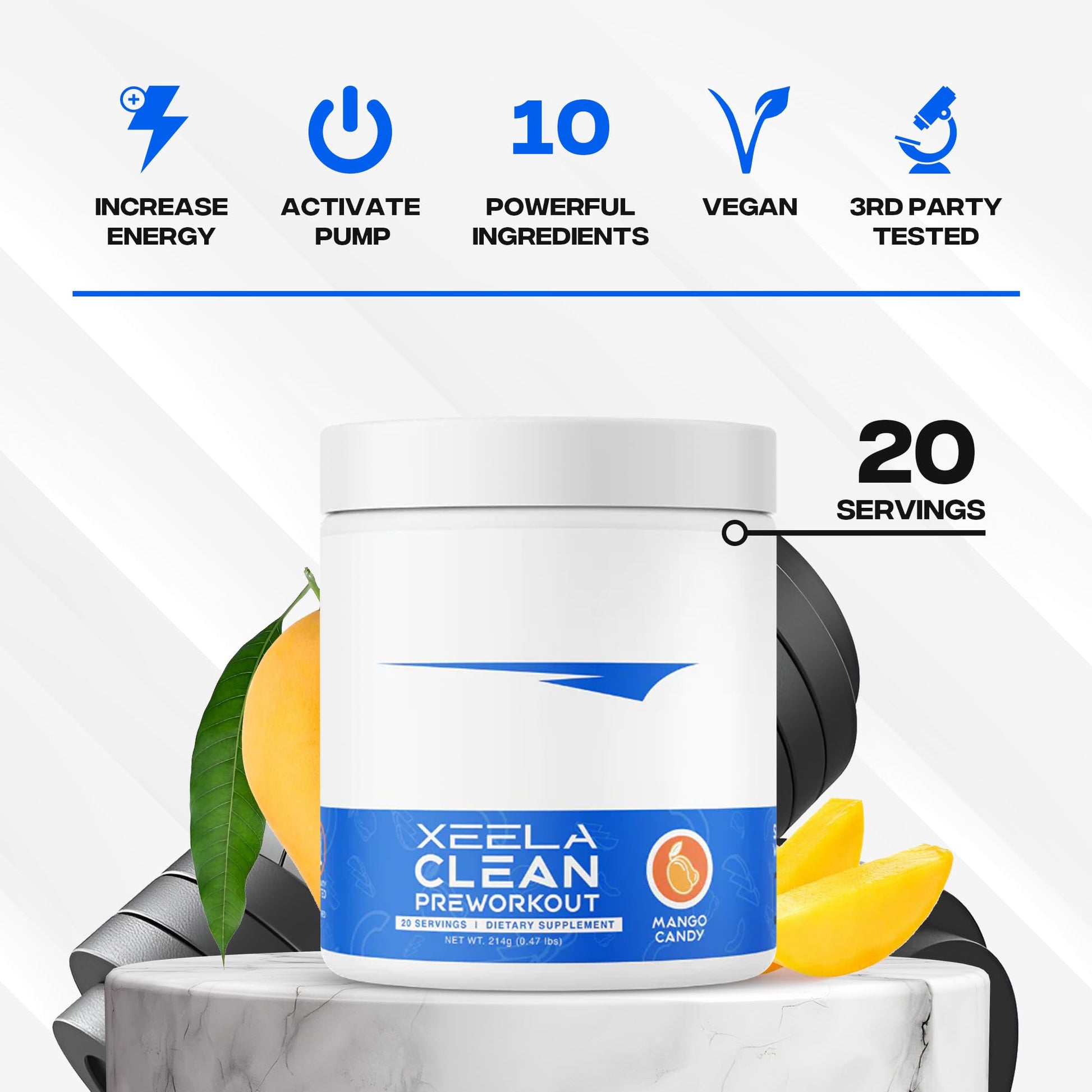 XEELA Pre Workout - Clean & Tested - Jitter Free, Safe, and Natural - Increase Thermogenic Energy, Focus, and Endurance w/Creatine, Organic Caffeine, and Plant Based Citrulline (Mango Candy)