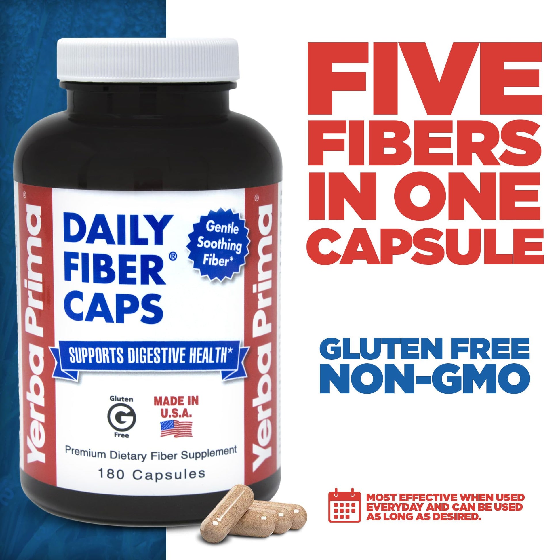 Yerba Prima Daily Fiber Caps - 180 Capsules - Soluble & Insoluble Dietary Fiber Supplement - Colon Cleanse - Gut Health - Vegan, Non-GMO, Gluten-Free