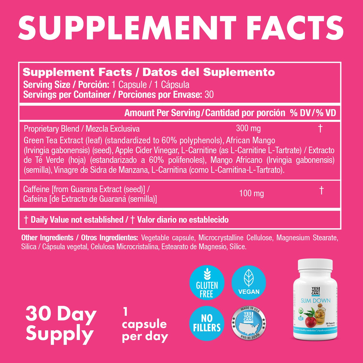 - GREAT VALUE: At Yes You Can!, we believe in providing people with highly nutritious supplements at great value. That's why each Slim Down vitamin bottle contains thirty (30) easy-to-take capsules for a one (1) month supply.