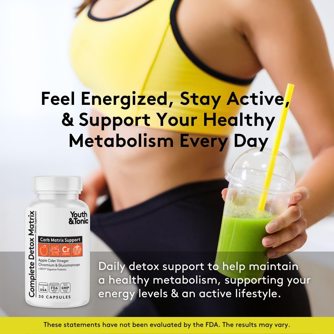 Youth & Tonic Balanced Detox Pills as Complete Gut Cleanse & Carb Matrix Support with ACV, Glucomannan, Chromium for Body Detoxing & Digestive Health, Supplement for Men & Women, Third-Party Tested