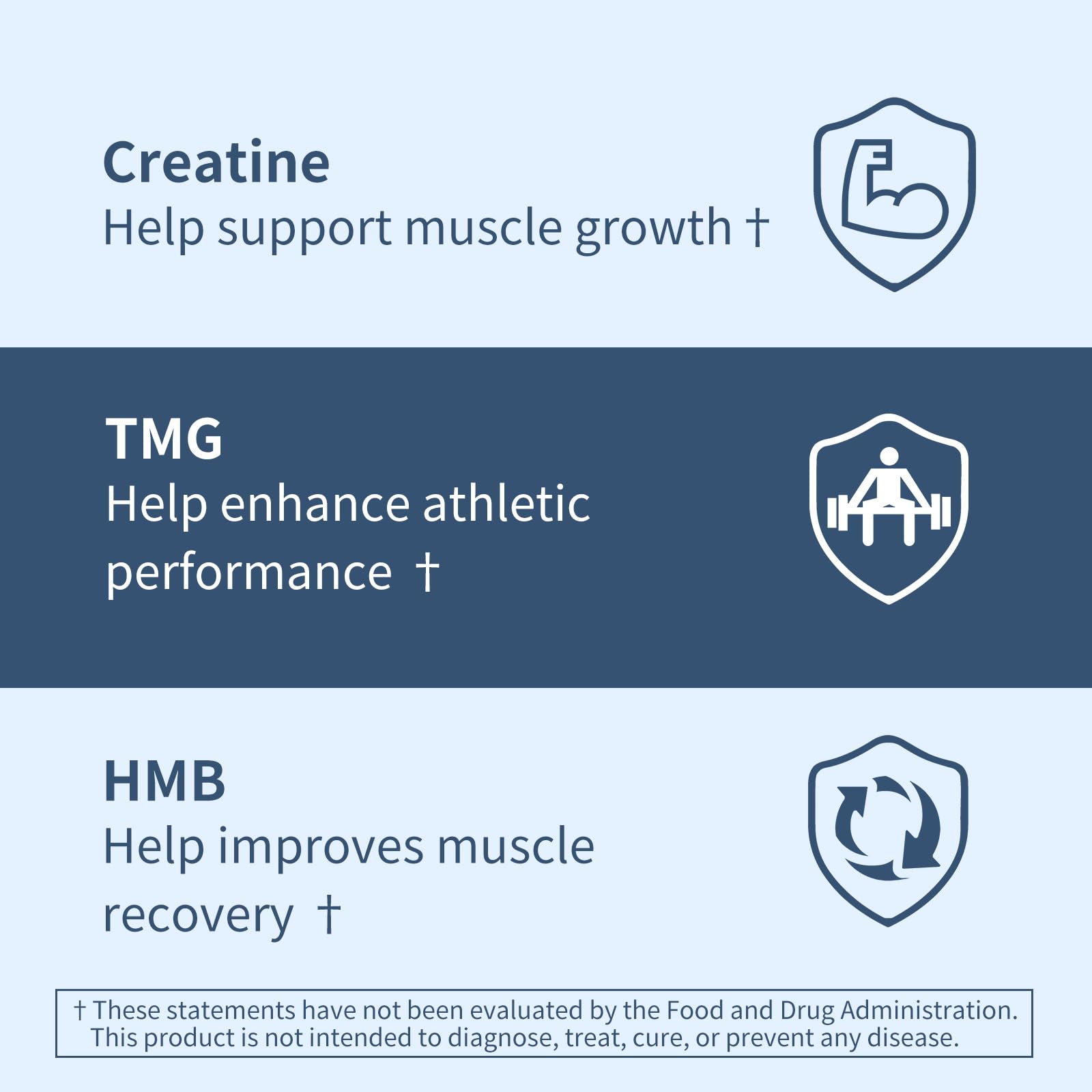 - Optimized Exercise Performance: Creatine Monohydrate and TMG work together to enhance both short bursts of high-intensity activity and overall endurance. With the added benefits of HMB reducing muscle damage and fatigue, this triple-action supplement ensures you can perform at your best during every workout