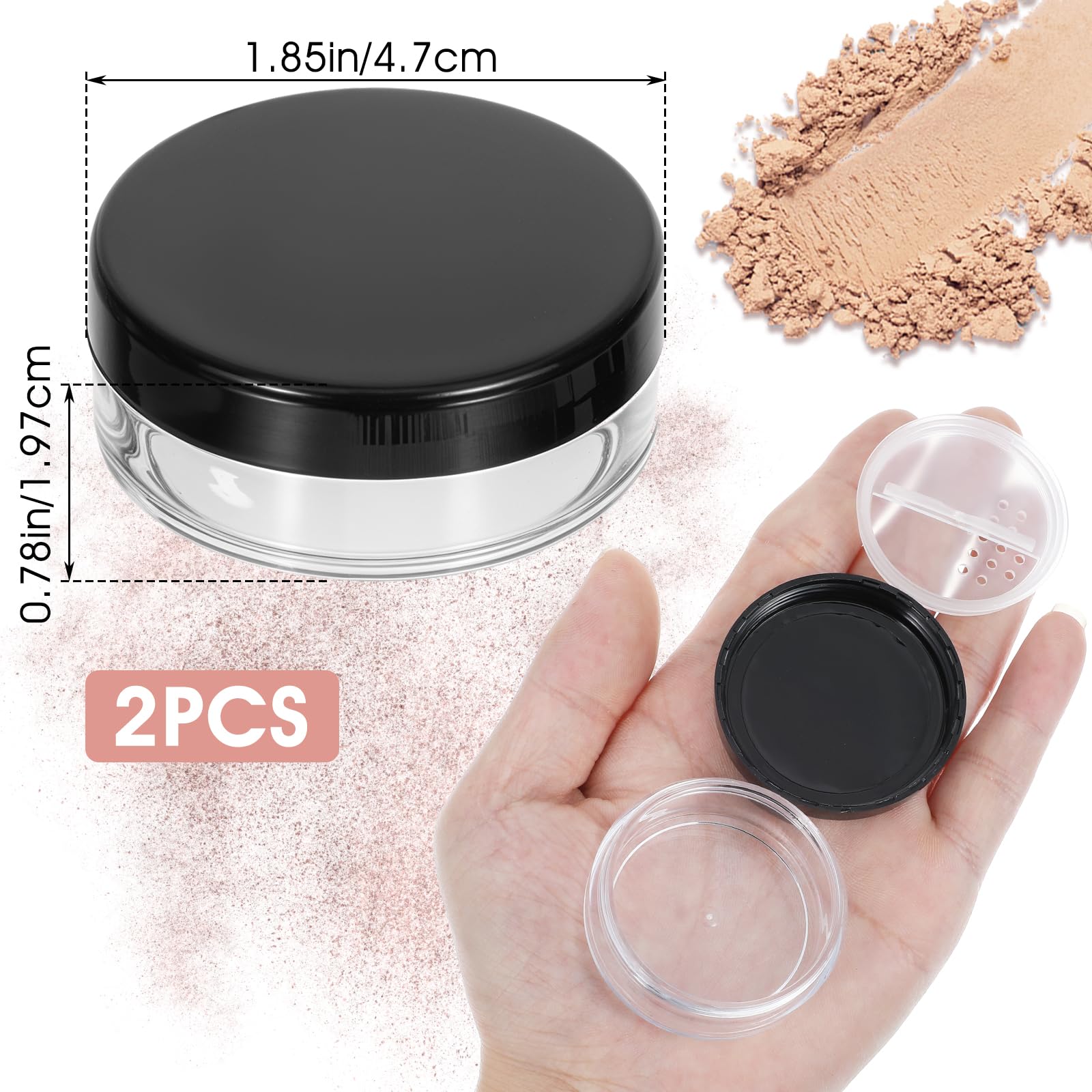 - Size: This loose powder case is 1.85 inches ( 4.7 cm ) in diameter and 0.78 inches ( 1.97 cm ) in height, compact and lightweight, easy to put into your makeup bag or pocket. Whether for daily makeup touch ups or travel use, this makeup holder is easy to carry without taking up much space. Compact size design makes this makeup case a single item for women