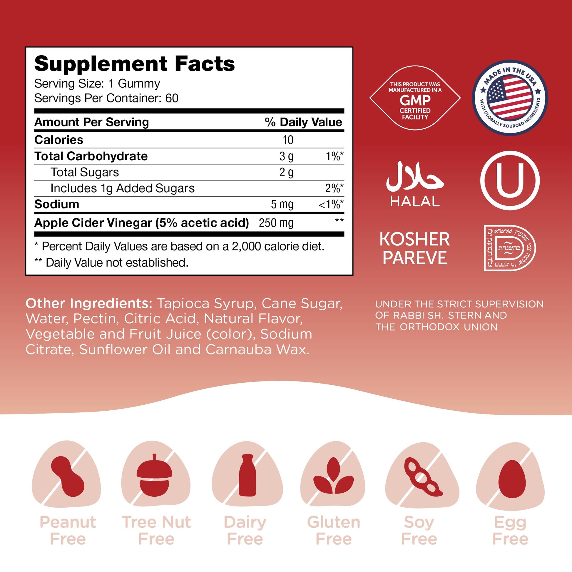 - CERTIFIED KOSHER - Our apple cider vinegar capsules are made with strict quality and potency requirements and are certified Kosher. Take one gummy daily or as directed by a healthcare provider, gummy should be chewed before swallowing.