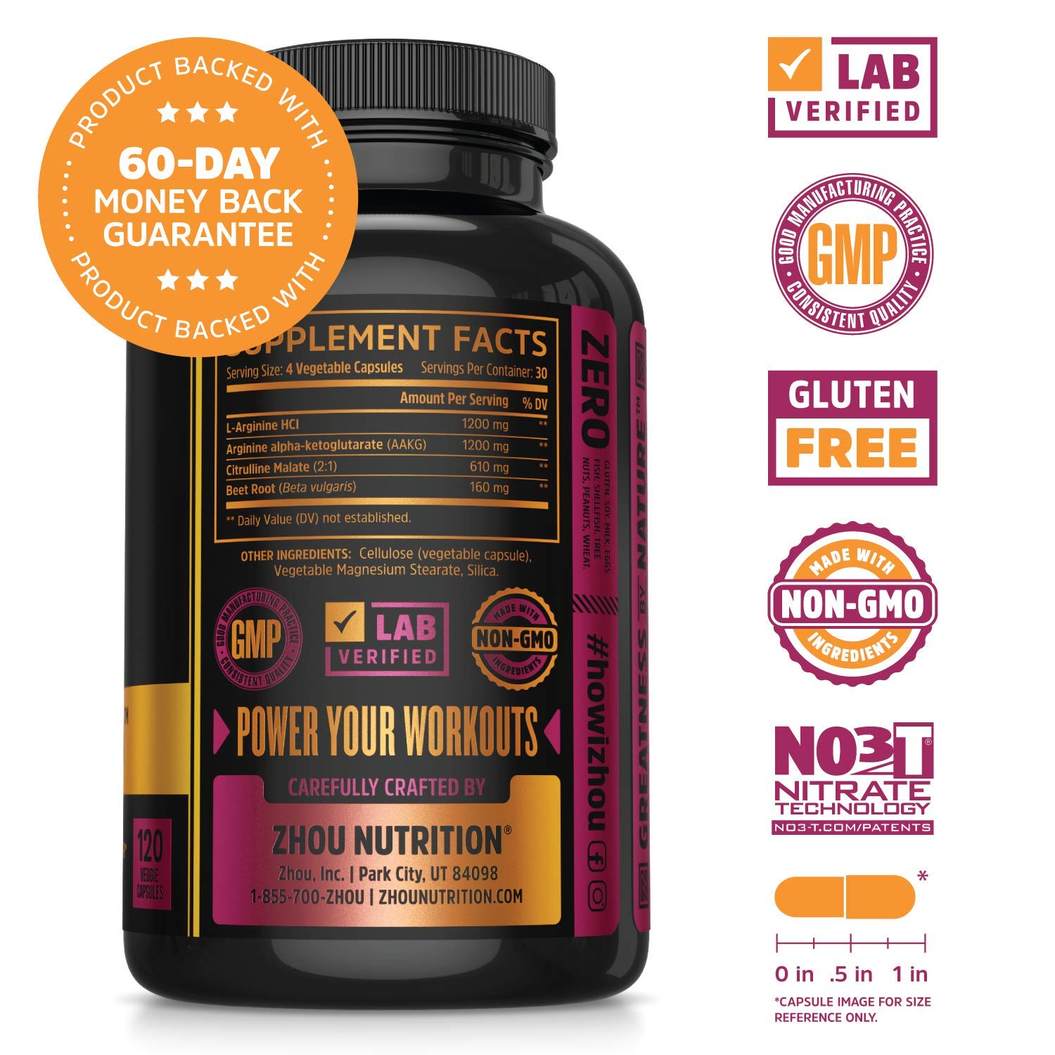 Zhou N.O. Pro - Premium Nitric Oxide Supplement for Men & Women, Heart, Muscle & Blood Support with Beet Root & L Arginine, Natural Nitric Oxide Booster - 120 Veggie Capsules