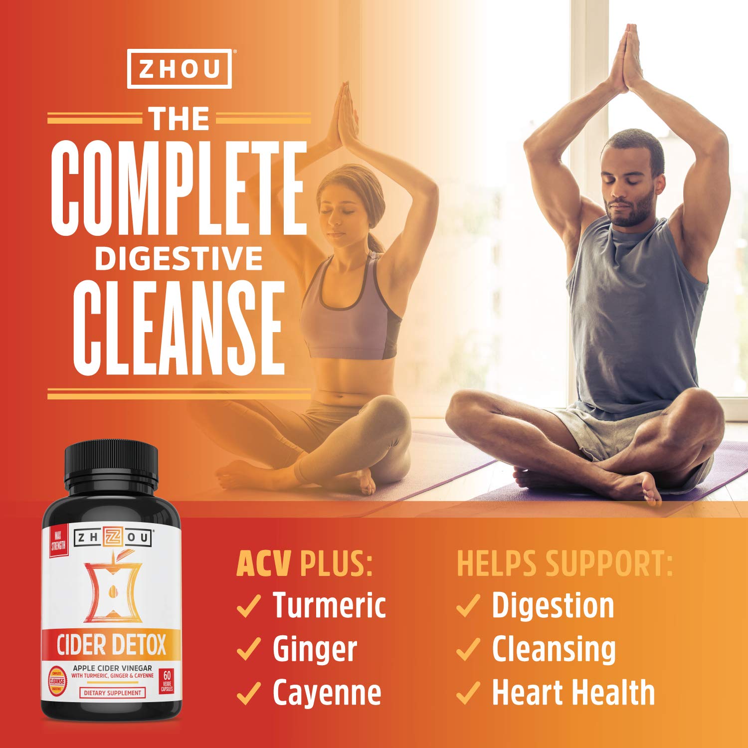 Zhou Nutrition Cider Detox Apple Cider Vinegar Capsules with Ginger, Turmeric & Cayenne, Max Strength Thermogenic Formula for Improved Digestion, Detox, Heart Health
