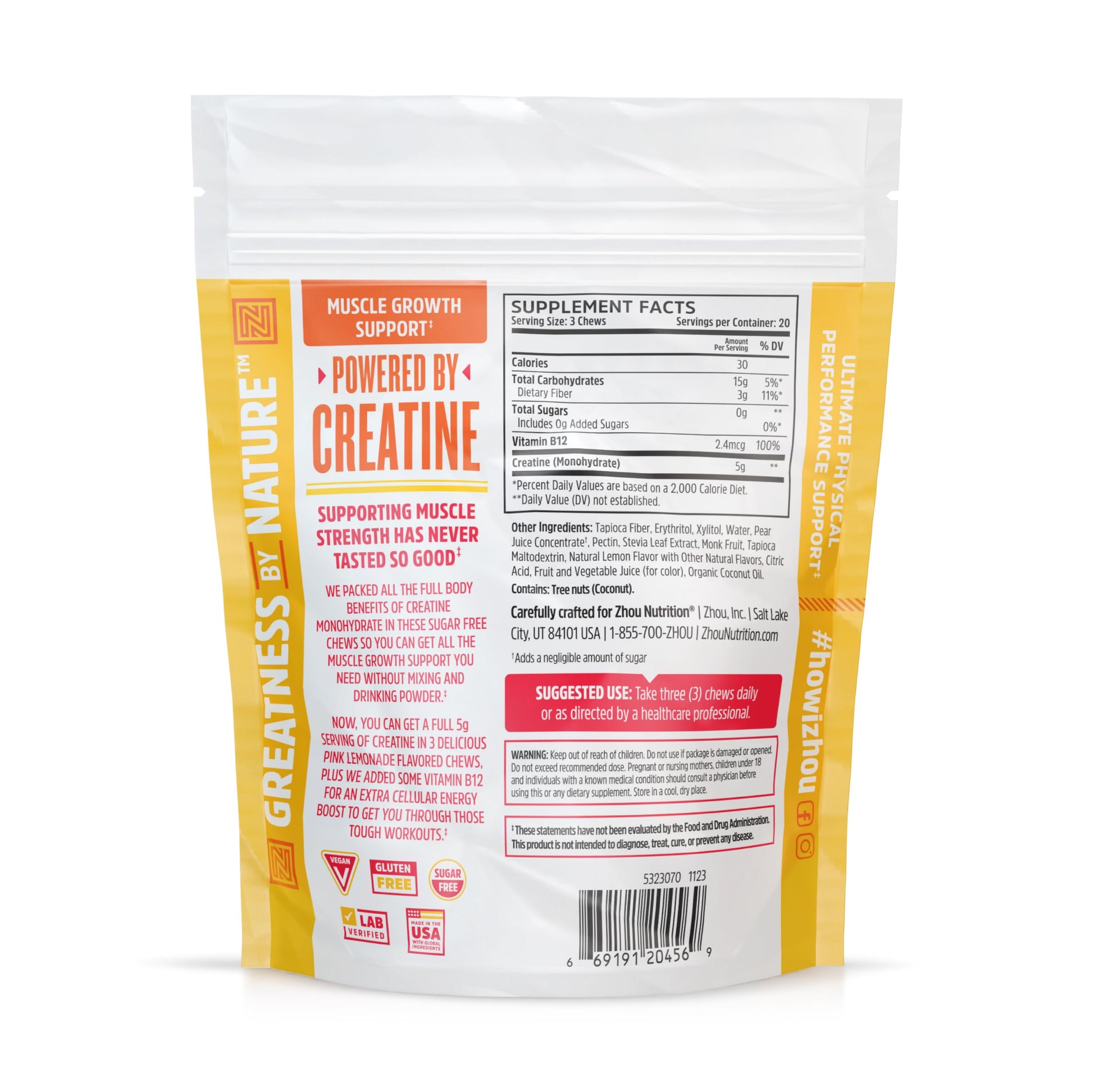 Zhou Nutrition Creatine Monohydrate Chewables 5g for Men & Women, Sugar Free, Organic, Non GMO, Pink Lemonade, 60 Creatine Gummies